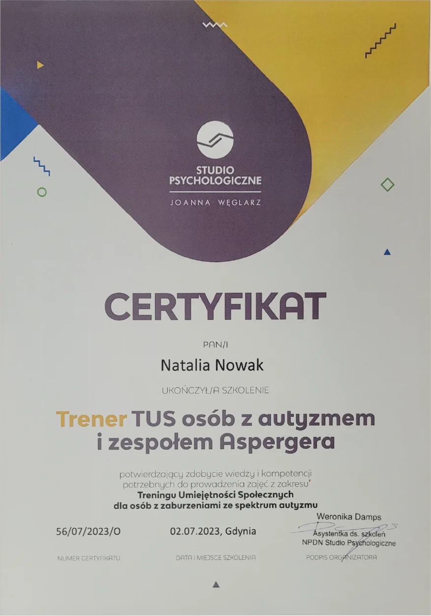 Ukończyłam psychologię na Uniwersytecie Wrocławskim. Odbyłam kurs I stopnia Terapii Skoncentrowanej na Rozwiązaniach (TSR) oraz liczne szkolenia w zakresie diagnozy psychologicznej dzieci i młodzieży. Jestem certyfikowaną diagnostką ADOS-2 oraz uczestniczką szkoleń z zakresu pracy z układem nerwowym, diagnozy funkcjonalnej i wsparcia dzieci neuroróżnorodnych. Systematycznie rozwijam swoje kompetencje uczestnicząc w specjalistycznych szkoleniach, interwizjach i konferencjach branżowych.